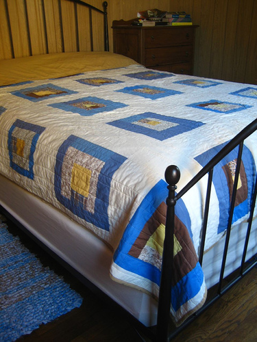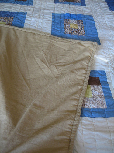 Hey, here's something cool: because Lauren lives in Connecticut where a thin quilt doesn't cut it in the winter I turned this quilt into a duvet so she can use it year round. I quilted together the quilt top, batting and a queen sized sheet from Ikea. Then I bound that together with the actual quilt back, leaving a three foot opening at the bottom to stuff a comforter into. It's convertible! Clever, aye?