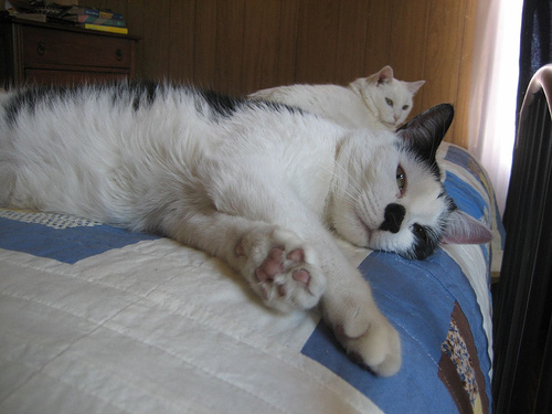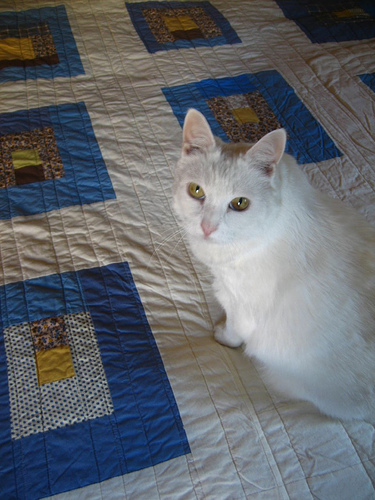 If the quilt weren't going to my sister I wouldn't let the cats love all over it. But where this baby's going there will certainly be much more of the like.