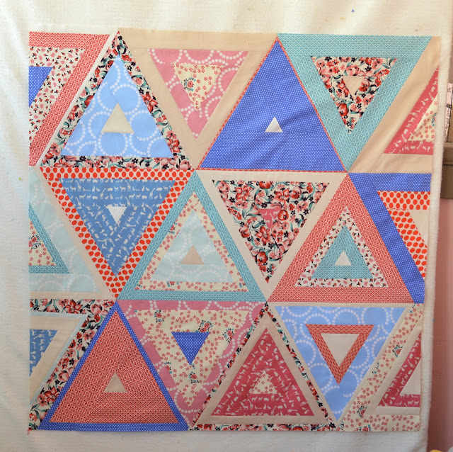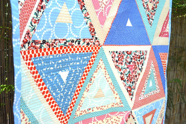 It's quite different from my original which used mostly solids. The key to using mostly prints like this is to keep any similarly colored and similarly scaled prints from being right next to each other. I kind of blew it on one pyramid. Can you spot it? The center triangle is a little too hard to distinguish from the row around it.