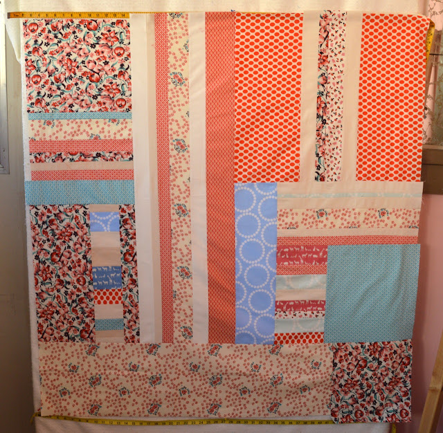 I ended up with the pieced sections you see below. I then laid them out on my design wall to then figure out what size pieces I needed to fill in the gaps. You can see that I pinned two tape measures to the wall to indicate how tall the back needed to be (the width of the wall was the same as the width I needed for the back). You could do the same thing with masking tape or painter's tape.