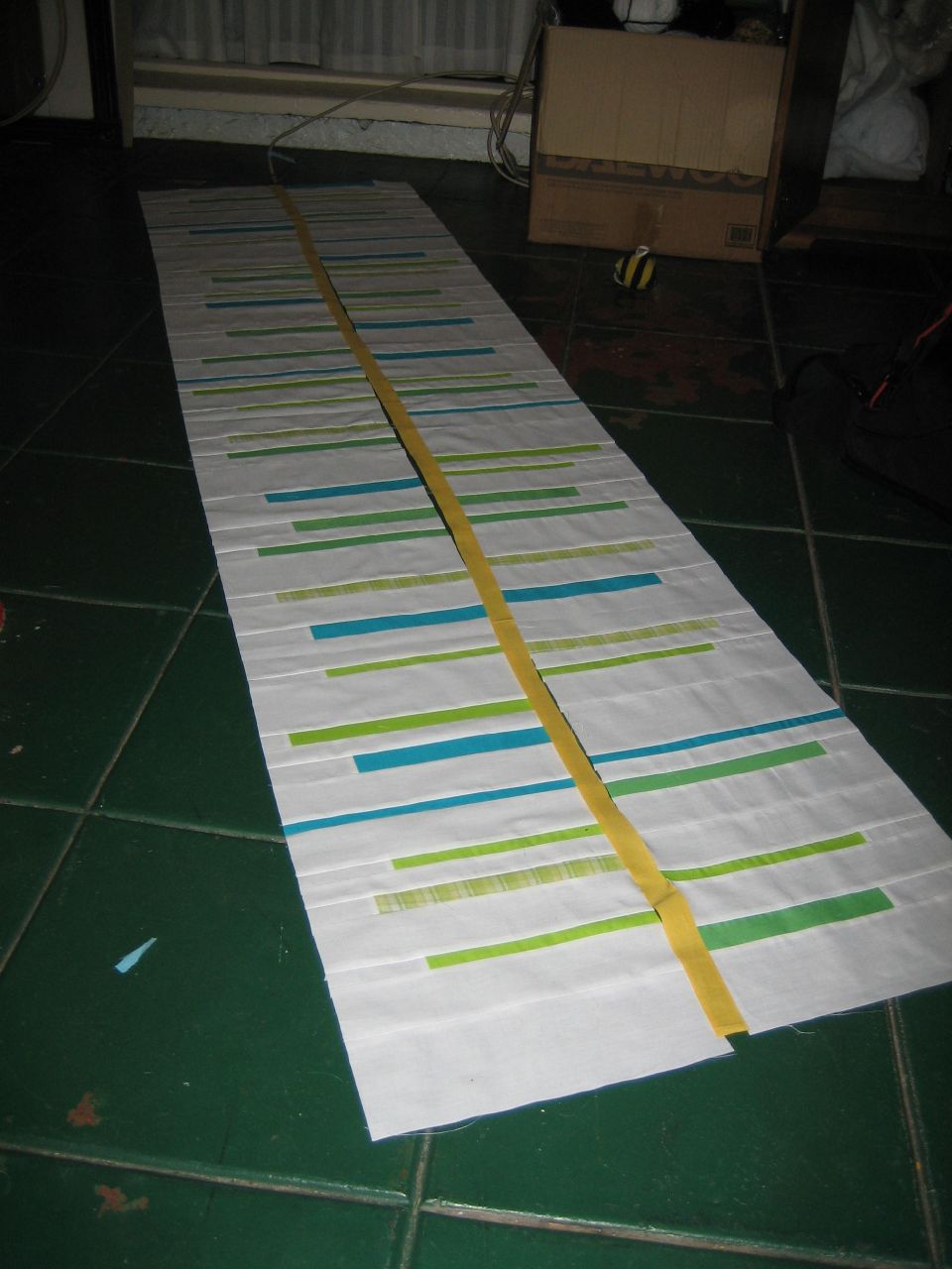 I was looking at patterns, hoping for inspiration and I found this quilt on the Denyse Schmidt website. So that's what I'm doing. It's working out pretty well so far. I really hurt my brain trying to plan out how many of which color strips at what width and what length. That sort of thing gets really jumbled up in my head but I'm glad I did it. That way I only cut the fabric that I needed and it was much simpler to lay out the final pattern without having to worry about using too much or too little of any one fabric.Here is my center panel.