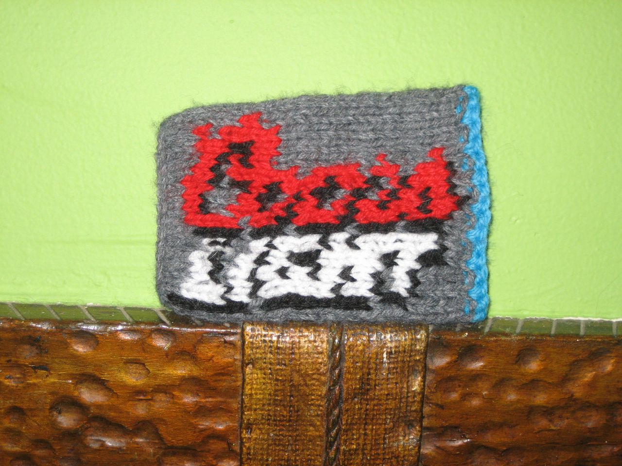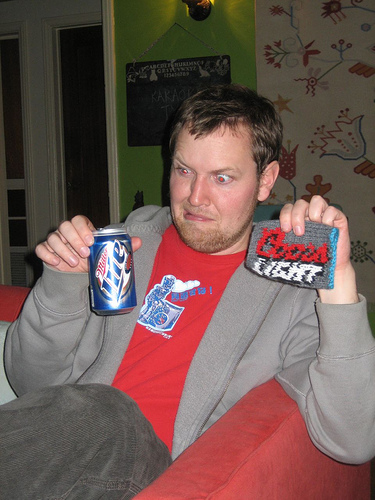 Using US size 8 needles, cast on 35 stitches with the gray yarn. Don't worry about your cast-on row being a little tighter, it's good if it wraps under the bottom of the can. Knit rows in stockinette stitch. Knit 10 stitches, place a marker, knit first row of chart, place marker and then finish out the row. Follow the chart, working inbetween your markers, to the end and then bind off. Sew the two short ends of the rectangle together to make a tube. Insert cold beer can of your choice. Open beer, drink beer, enjoy how cold your beer tastes and how not cold your hand is.