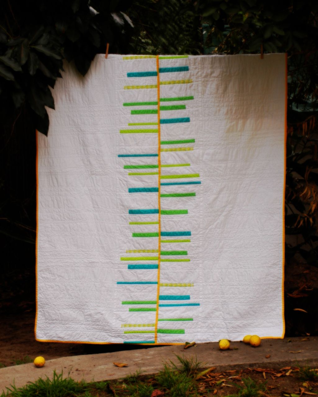 As I mentioned before, this quilt was inspired by this design on the Denyse Schmidt website. The design takes full advantage of the two things I love most about DSQ: #1, irregularity and the appearance of randomness in shapes and placement and #2, the use of a neutral color as a background as opposed to an all over design. And now that I'm on the subject I've thought of another: #3, choosing a very high percentage of solid fabrics over patterned ones. I really love the clean, modern look that you can achieve this way. It makes the design really prominent and also makes the few patterns that you do use really stand out. For this quilt I used all solids except for one plaid for some of the stripes and a flowered vintage-looking print for the backing.The design isn't totally random. I tried to work out how many stripes of each color I would need and in which widths and lengths to keep it somewhat balanced. I used the same number of each on either side and simply laid them out randomly on the floor along with white strips of different widths. I rearranged one or two stripes but was quite happy with my initial "random" layouts.