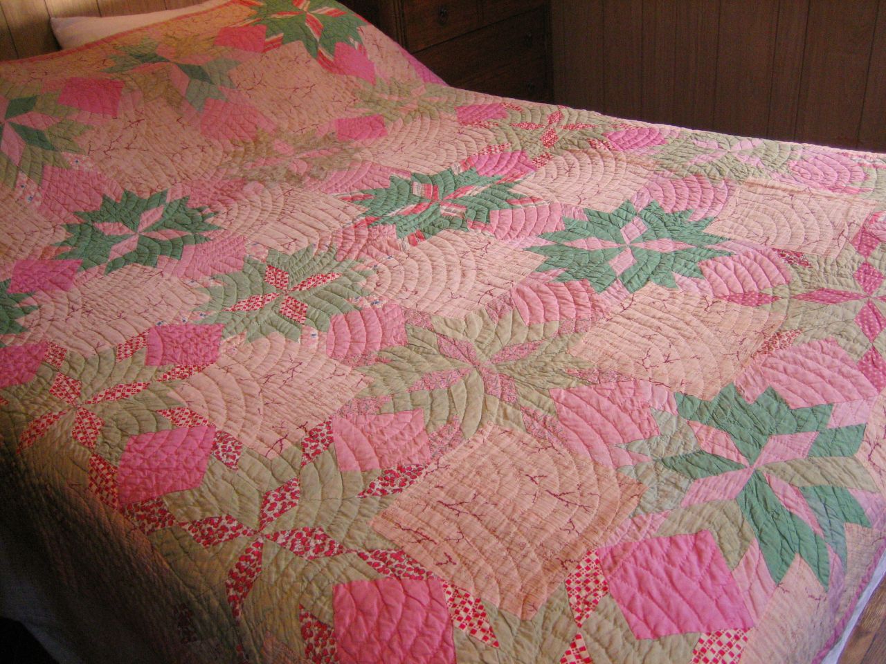 Number one: this amazing vintage hand sewn quilt! I love love love it. I'm not always crazy about traditional quilt patterns but whoever chose these fabrics was some kind of old timey genius! I just love the colors in this quilt. The deeper pinks and reds give it so much vibrancy and life. Very gutsy choices, I think. Plus there are so many great fabrics in there. I wish that I had them to work with. I don't quite know what we'll do with this quilt. It won't be on the bed, don't worry. We need some sort of open quilt storage for this and for the quilts Harv's mom made us (also in perfect romantic colors).