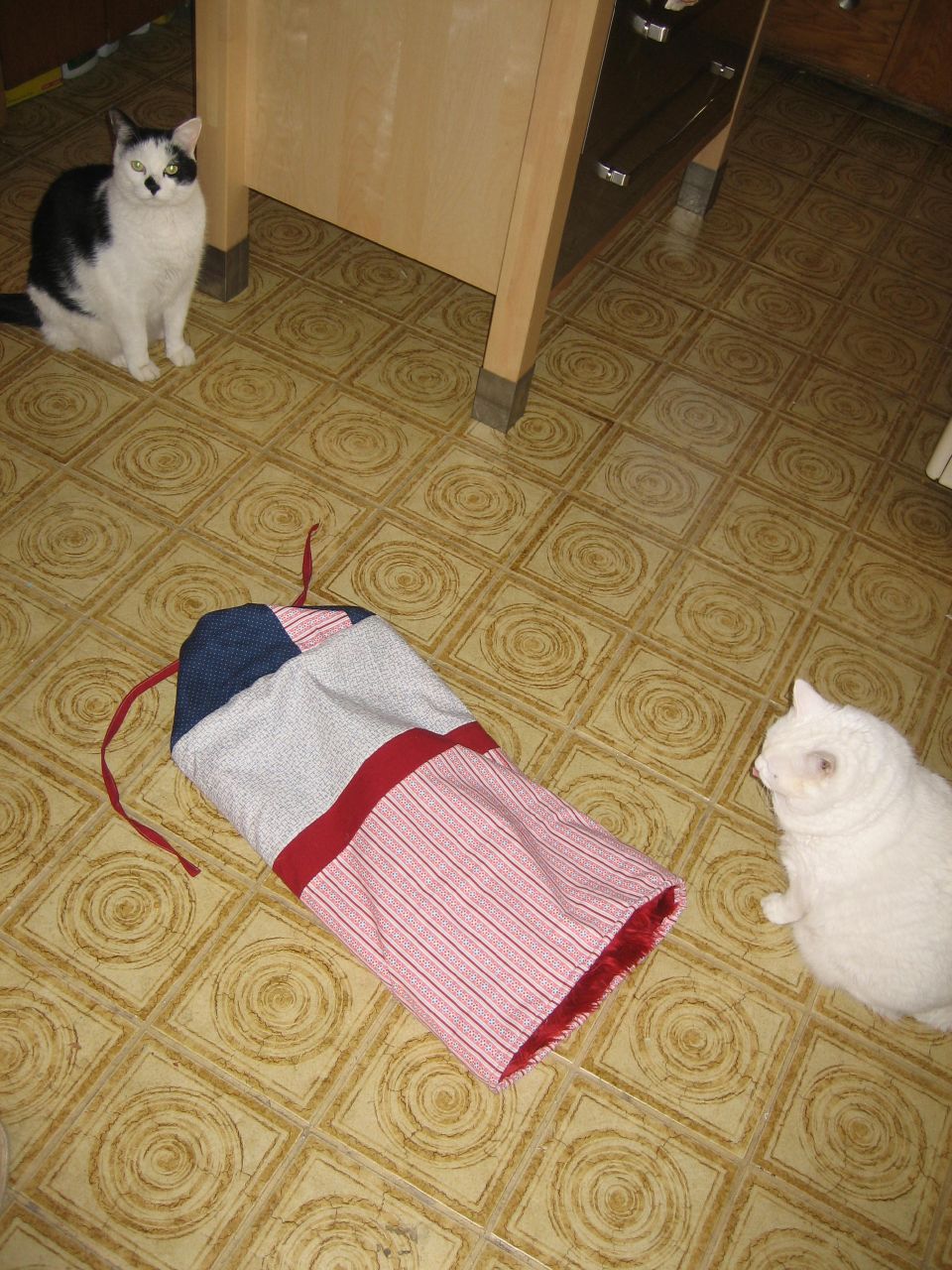 I attempted to make a "cat tube" loosely based on a pattern from Amy Butler's In Stitches. Actually, it is loosely based on the picture in the book, not the pattern. I don't actually own the book. Oops. I guess as punishment for not buying the book, our cats refuse to use the tube. See how they are repelled by it.