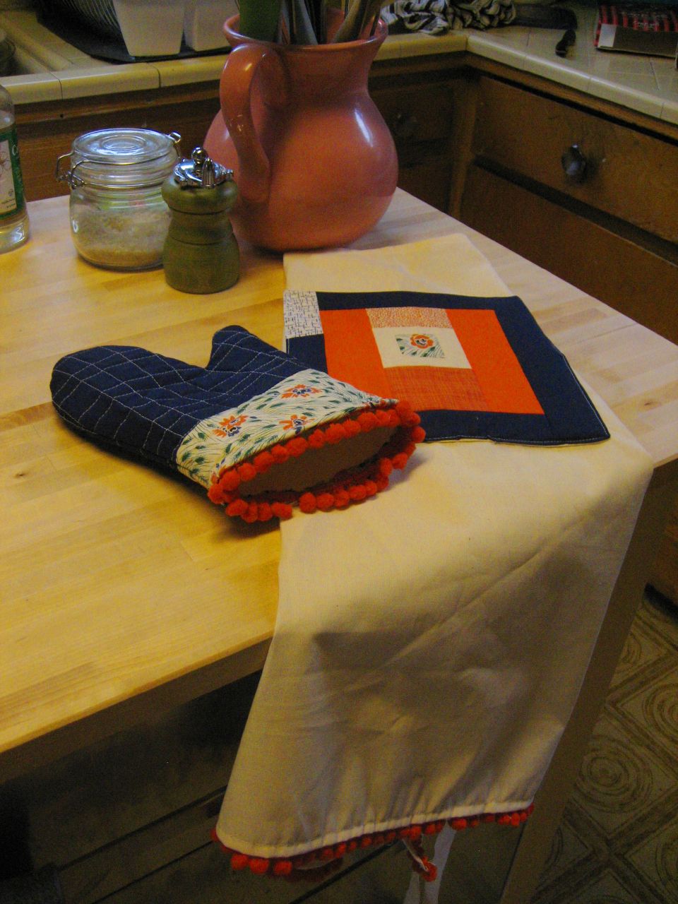 Unfortunately the oven mitt is not quite as functional as it should be. The pattern just calls for one layer of batting and I used two but it is still isn't quite thick enough. And it was really difficult to sew through all of the layers plus the pom-poms. Since the next one I'm making won't have pom-poms I should be able to add another layer of batting. I don't want to burn any hands!
