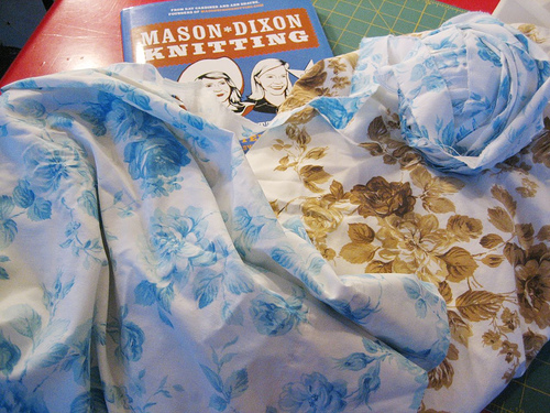 And last, not from the flea market, two flowered sheets that I bought at an estate sale. From an idea in "Mason-Dixon Knitting" I ripped each sheet into one loooong 1 inch strip and wound them into balls. I am knitting two striped rugs to go on either side of our bed. The book suggests using size 15 needles but I'm using size 19. It's very satisfying. The rugs are all stockinette stitch and they are very squashy. I can't wait to sink my tootsies into one every morning.