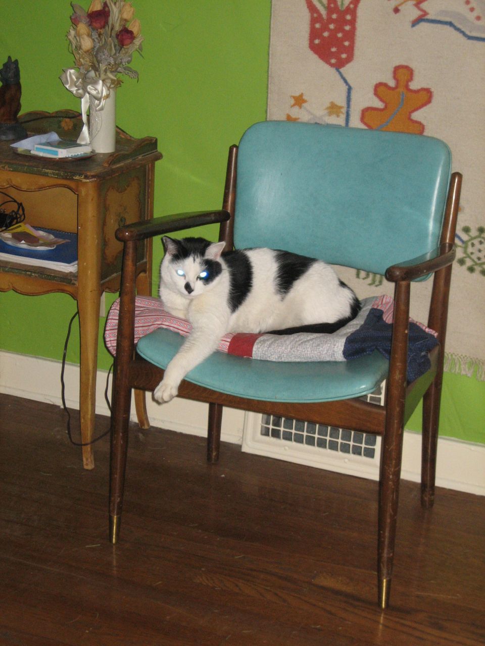 I put it on this chair and Stabone has started laying on it every night! He sleeps on it so much that Lilly has started to lay on it just to spite him! She does that sort of thing sometimes. She likes to take things away from Stabone.