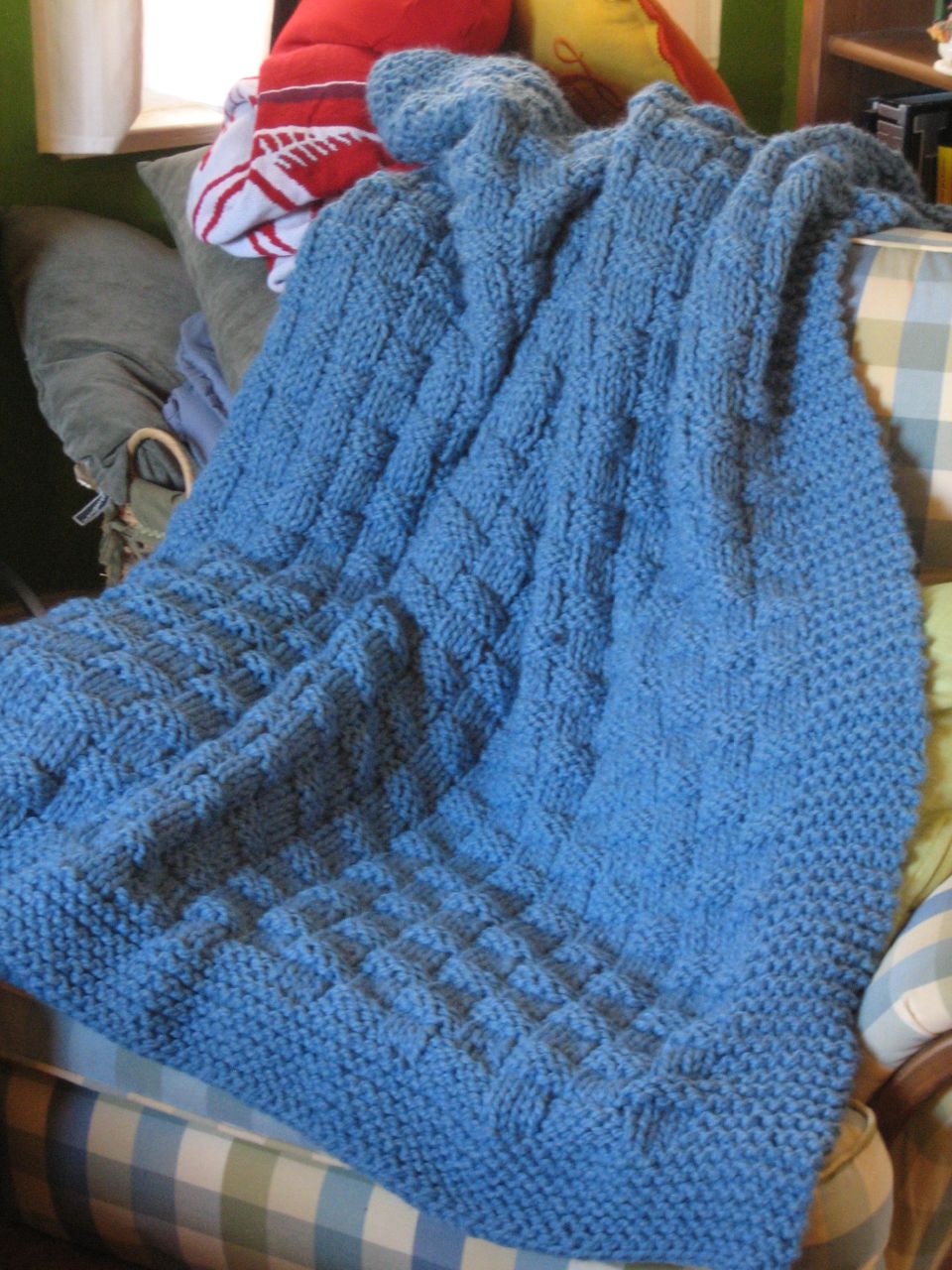 First, this lovely afghan knit by my mom. I suggested the color and she chose the pattern because there was a cat laying on the afghan in the picture. That works for me!