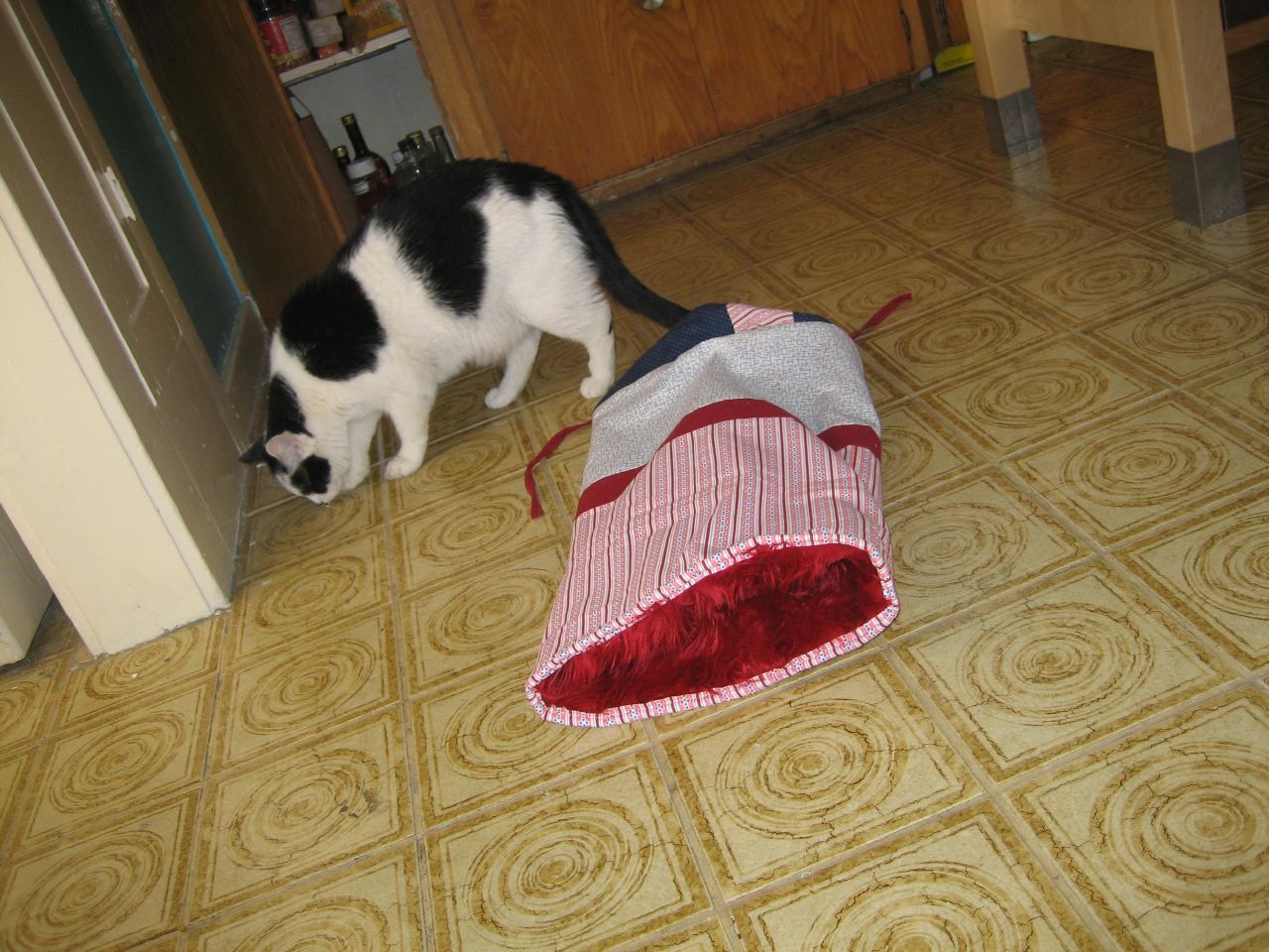 I was considering taking it apart and making a cat pillow using the fur lining for one side and the outer shell as the other. But then this happened: