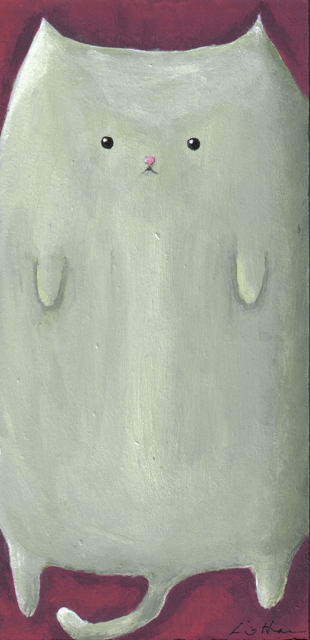 This is based on an idea that I had a while ago. I love cats (obviously) and I love images of stylized cats that are more like big blobs than really animals. Cats really are very good at contorting themselves into tiny little legless balls or big fat blobs with paws and eyes. This painting is Lilly, stuck in some sort of tube, maybe a chimney. I like to think of cats as big masses of fluff that can change shape and be stuffed into different containers. I really like how this painting turned out. I don't know if I'll paint cats stuck in other things or more like this. I like how she's just on display but doesn't really care. Very much like the real Lilly.