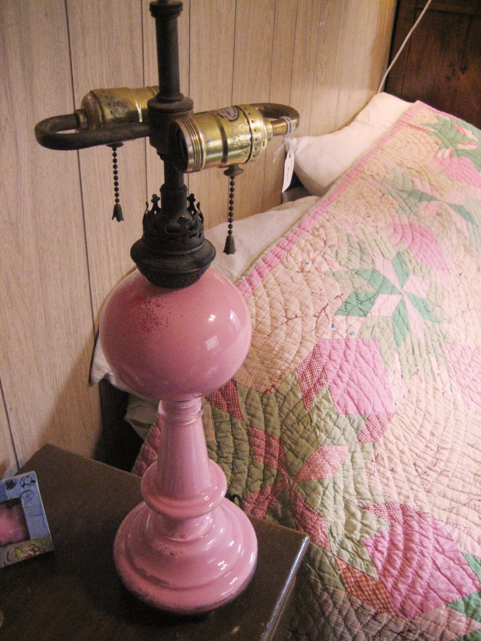 Number two: This sweet pink glass lamp. It doesn't have a shade. I'm thinking of embellishing one with Victorian images of birds or something. I bought two cds of Victorian ephemera on EBay awhile ago that have hundreds of great images.
