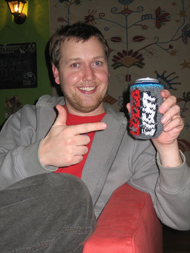 Using US size 8 needles, cast on 35 stitches with the gray yarn. Don't worry about your cast-on row being a little tighter, it's good if it wraps under the bottom of the can. Knit rows in stockinette stitch. Knit 10 stitches, place a marker, knit first row of chart, place marker and then finish out the row. Follow the chart, working inbetween your markers, to the end and then bind off. Sew the two short ends of the rectangle together to make a tube. Insert cold beer can of your choice. Open beer, drink beer, enjoy how cold your beer tastes and how not cold your hand is.
