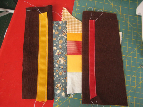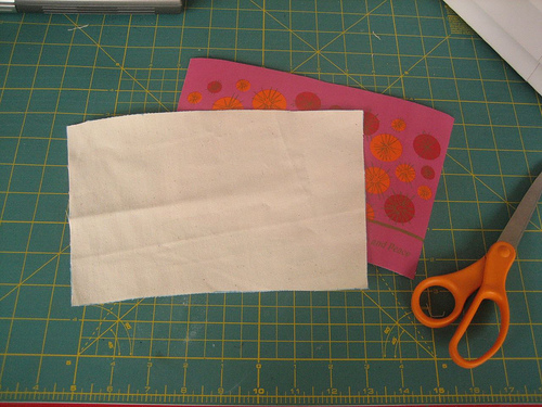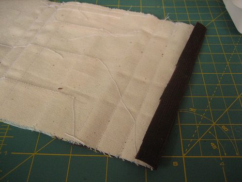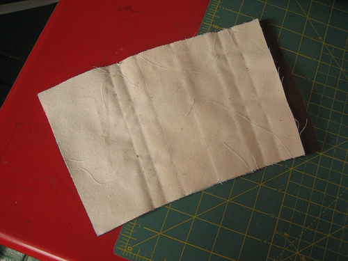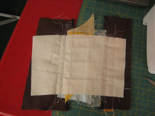 and trim the excess fabric all the way around the foundation, leaving about 1/2 inch extra on one of the straight sides.