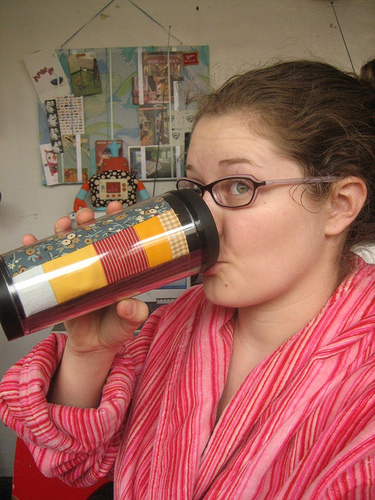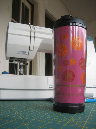 quilty sleeve into your mug making sure your pretty folded edge is covering your ugly raw edge. You may have to do a little bit of trimming. I had to cut about a half inch off of the top of my sleeve because it was too fat to fit at the very top where the mug fits together more