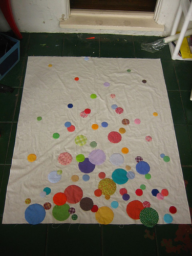 3. Take your little scraps and just go string piecing nuts all over that foundation like so: