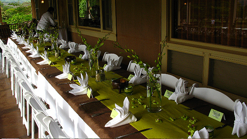 The wedding colors were inspired by the outside of a pineapple and since it was a little more on the casual, beachy side of things I went with linen in chartruese-y green and coffee brown. The bride just sent me this picture. Apparently there was some sort of miscommunication with the table measurements. They were supposed to be runners, albeit somewhat wide ones. Instead they spill over the sides of the tables. But I think that's okay! So... congratulations Sarah and Olivier! I wish we could have been there! (And I hope you don't mind me sharing your photos!)