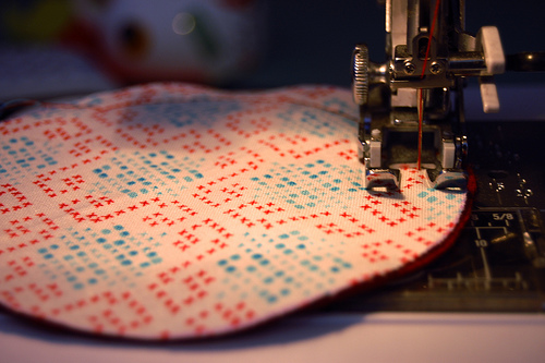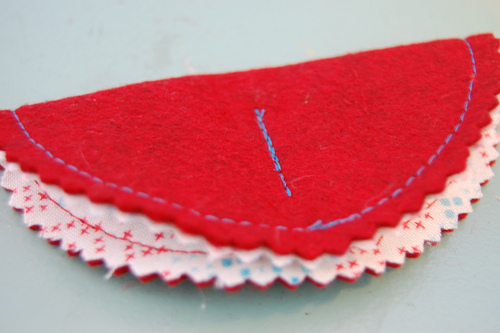 Fold the circle in half with the cotton side together, felt on the outside. Sew about an inch seam down the middle, not sewing to the edge of either side of the half circle. Be sure to back stitch a few times.