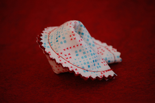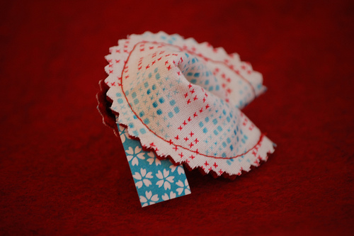 When Sew Mama Sew started their tutorial contest I thought "Great! I will write a tut' and enter." So I took some pictures of the process I use to make my fabric fortune cookies. Then...I let them sit there. And now the contest is over. Which is really okay. The real motivation for me to enter things like this is to share with people who don't ordinarily read this blog, not to win. So in the continued spirit of not winning anything I present you with the "Lady Harvatine Style Fabric Fortune Cookie Half-Assed Tutorial".