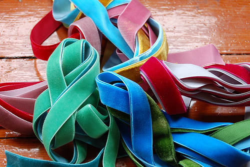 I also bought a whole mess of velvet ribbon. I couldn't resist, they were all so beautiful and I think that they're even more beautiful in a group! The super bum here was that I asked for a yard and a half of each but didn't realize until I got home that the girl only gave me a yard of each. She charged me correctly but a yard just isn't quite enough to be really useful.