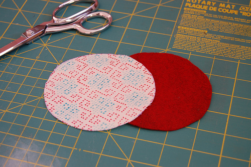 Lay the cotton on top of the felt, right side up, and line up the edges. Sew a half inch seam around the entire circle. I use my walking foot for this but you don't have to.