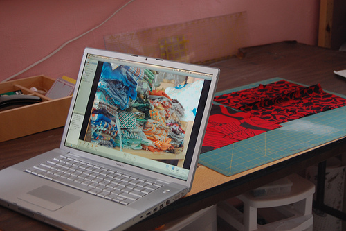 Necessity has pulled me from the non-sewing doldrums. My new computer fits nicely in the "Pleated Beauty" bag that I made. It's quite convenient for toting my laptop to work and back along with the rest of my crap essentials. Unfortunately, as messy as the insides of my purses tend to get I'm afraid the computer may get a bit dusty.