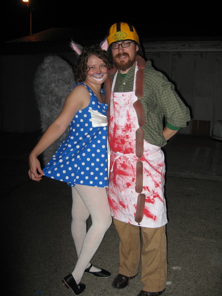 The dress was from an actual pattern (I'm sorry I don't know what!) that I shortened A LOT and widened the boob ties. I whipped up a matching pair of puffy underpants/diaper cover (no, there was no diaper). The tail has some big ass heavy duty armature wire inside along with some fiber-fil. The wire is JB Quiked into a piece of 2x4 which is screwed to a nylon work belt from the hardware store. It was surprisingly not uncomfortable yet not surprisingly awesome to wear. And of course, the icing on the cake was a pair of tap shoes, ordered off Ebay, originally sent as two left shoes, I kid you not.