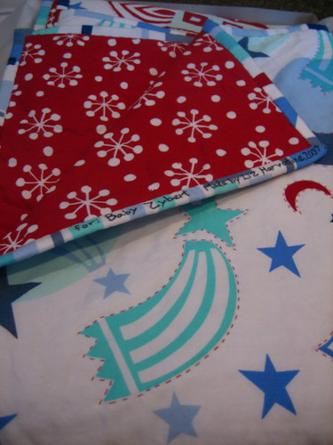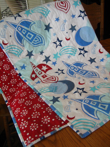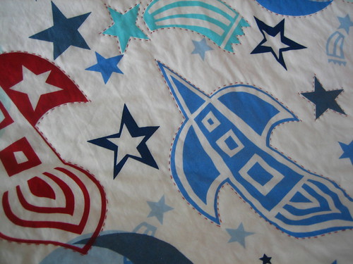 The idea to hand quilt around large motifs in the fabric came from Last Minute Patchwork and Quilted Gifts. The quilt in the book is very girly with large flowers. I had a hard time finding a fabric that would be suitable for a boy but still cool and not too cutesy. I don't like cutesy. I bought all three fabrics(front, back and binding) from Sew Mama Sew. You can find them here.