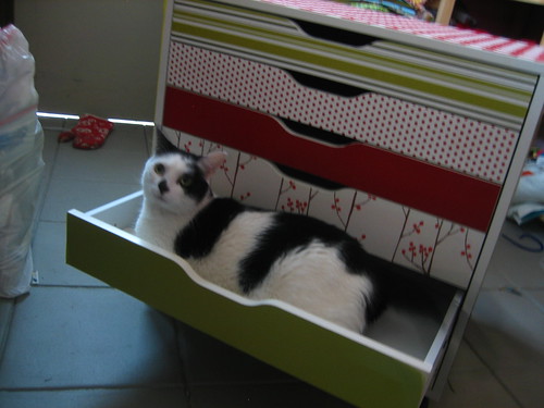 First, a cart. It's from Ikea and I decoupaged pieces of wrapping paper from the Paper Source onto the drawer fronts, top and sides before assembling it.