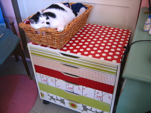 First, a cart. It's from Ikea and I decoupaged pieces of wrapping paper from the Paper Source onto the drawer fronts, top and sides before assembling it.