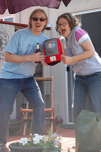 This machine is a much more manageable size than Pac-y, perfect for sitting on a shelf or the corner of a desk. (Seen here with the recipient for scale.)