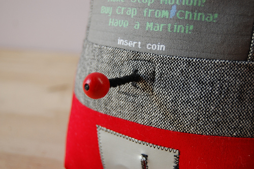 The joystick is made of pipe cleaner bent at a right angle and sewed to the inside of the machine with a painted wooden ball glued to the end.