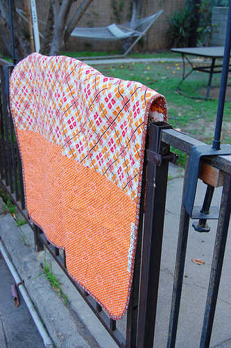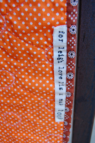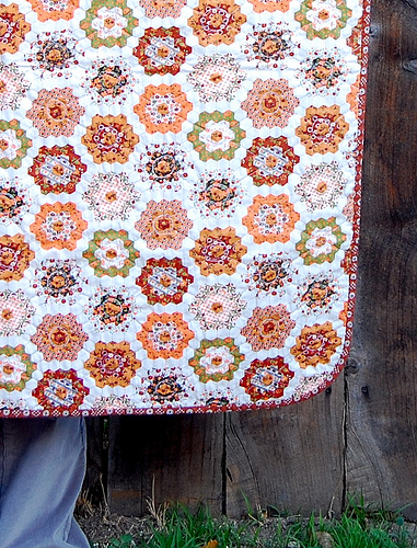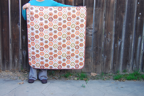 Leigh loves vintage clothing and I was originally going to use a vintage floral bed sheet for the quilt top but it just didn't seem like her style. I recently bought this orange hexagon fabric at a thrift store in Portland. I almost left it there. It was a neat old print but I couldn't really see myself using it. But...it was cheap and unique and I bought it anyway. Well when it came time to make Leigh's quilt I couldn't imagine fabric better suited to her than this. It was meant to be.