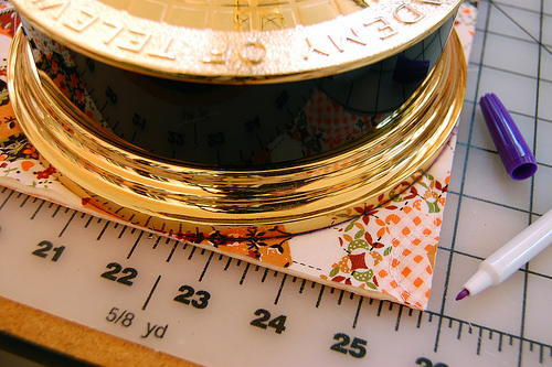 Just use some big circular object to trace a curve on the corners of your finished, un-bound quilt. I just used something I had lying around.