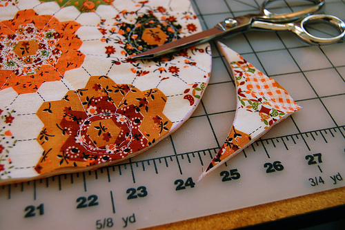 Leigh loves vintage clothing and I was originally going to use a vintage floral bed sheet for the quilt top but it just didn't seem like her style. I recently bought this orange hexagon fabric at a thrift store in Portland. I almost left it there. It was a neat old print but I couldn't really see myself using it. But...it was cheap and unique and I bought it anyway. Well when it came time to make Leigh's quilt I couldn't imagine fabric better suited to her than this. It was meant to be.