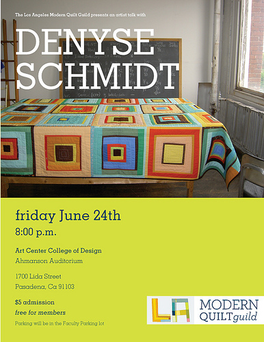 Denyse Schmidt is coming to speak to the LA Modern Quilt Guild tomorrow night and everyone is welcome! The talk is free for paid members of the guild and just five dollars for everyone else. I am very excited. Denyse's quilts were the first to really inspire me to try quilting and to this day her book is my favorite quilt book. So come if you're in town! Eight o' clock at the Art Center College of Design, Ahmanson Auditorium, 1700 Lida Street, Pasadena.