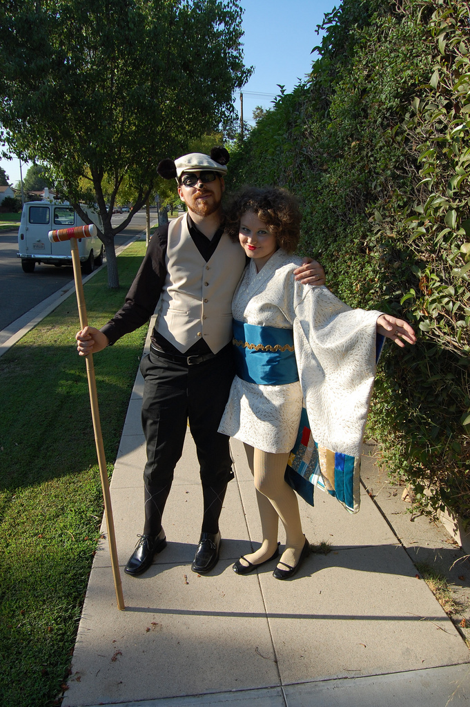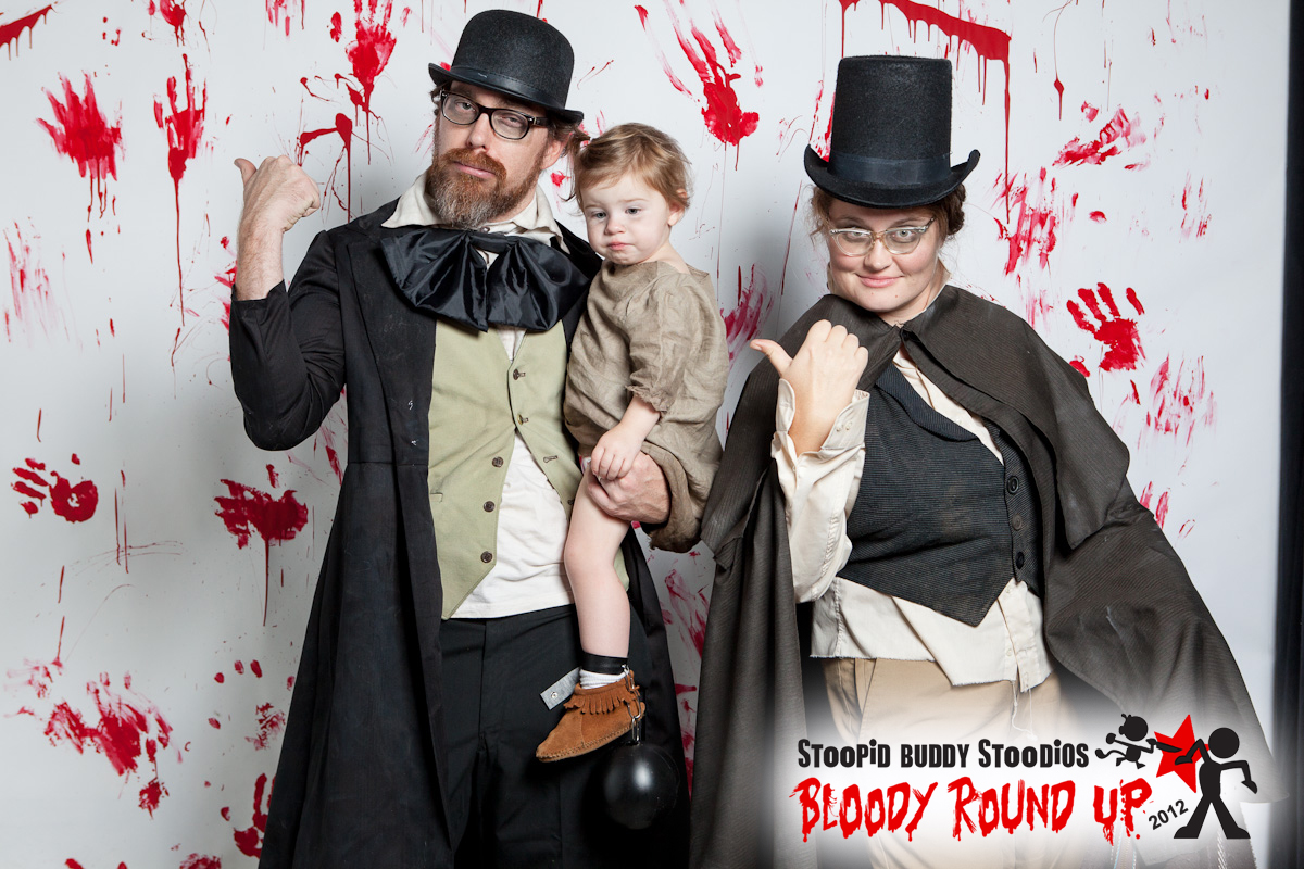 I made Harv's coat, dicky and bow-tie, my cloak and vest and Ginny's gown and wig/beard. Harv's vest and knickers were leftover from his Great Pandsby costume several years ago. I dyed or tea stained all of the lighter clothes and I aged the dark ones with sand paper and watered down white acrylic paint
