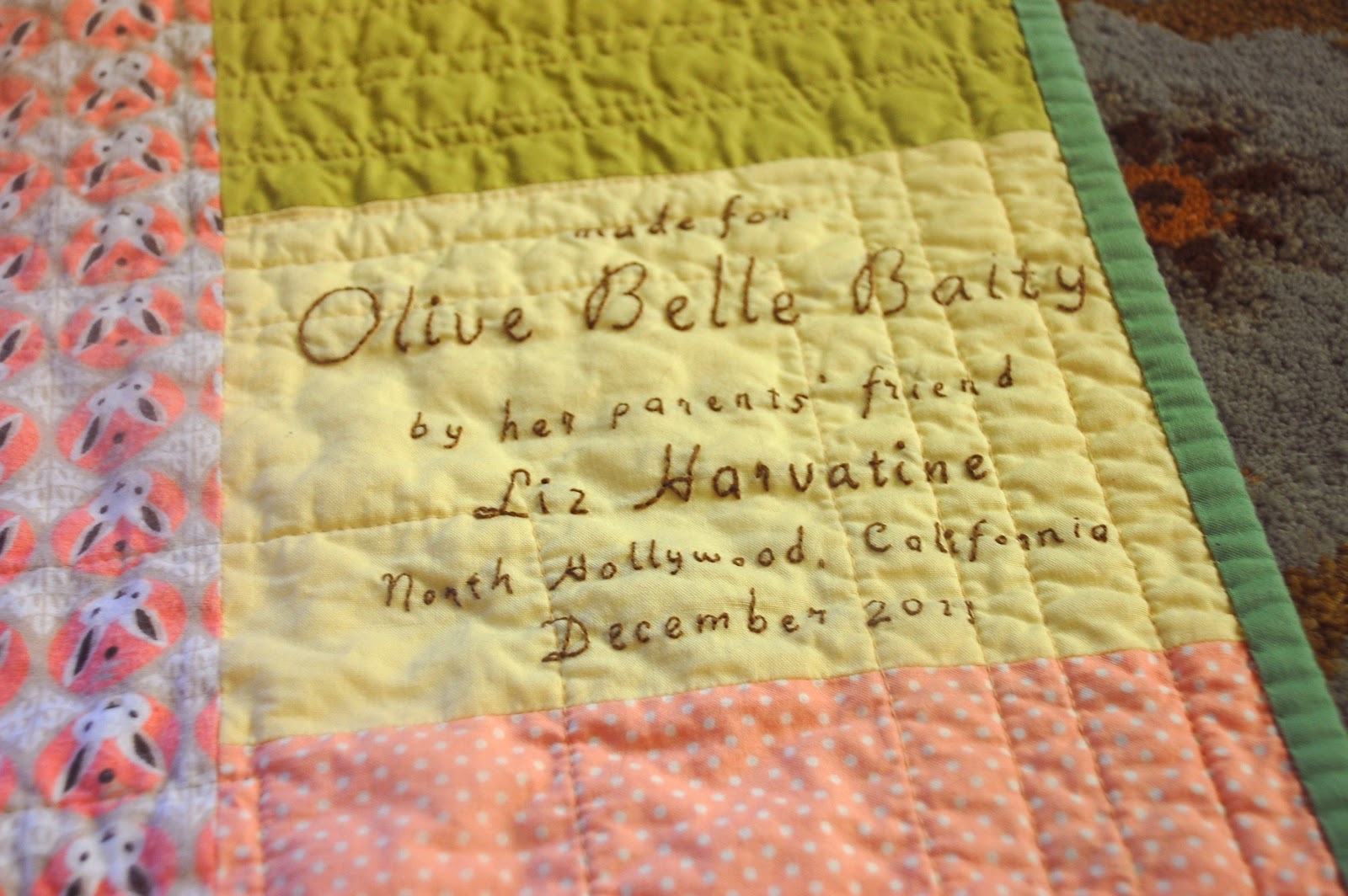 An embroidered label! You don't see those from me too often, do you? I did my usual tracing the computer screen but this time stitched over it. The larger letters have three strands of embroidery floss and the smaller letters have two. The bunnies on the back are flannel which made an especially snuggly quilt.