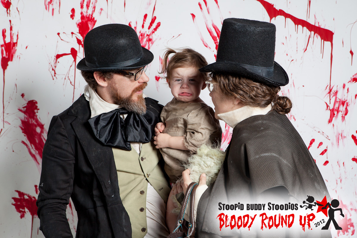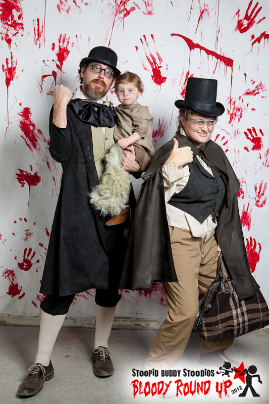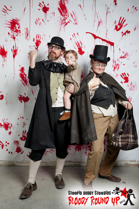 Family costumes! I was thinking of making Ginny a fun ghost costume (she makes a pretty cute ghost noise) and the idea of the three of us dressing as the hitchhiking ghosts from the Haunted Mansion popped into my head. I looked up some pictures online to refresh my memory and that sealed the deal. There's a tiny little one with a beard! If you're not sure what I'm talking about look here or here or at this especially fun one here.
