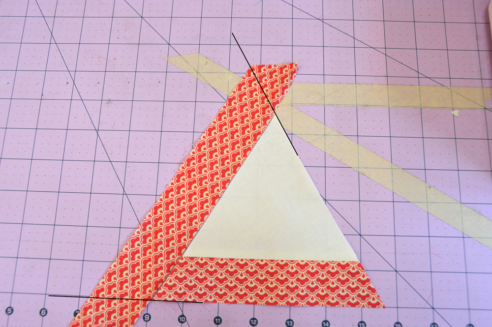 Start with one of your triangle centers and choose a strip to use for your first round of logs. Sew the strip to one side of the center, right sides together but before you do make sure that the strip extends far enough on either edge. Do not line the edge of the strip up with the tip of the triangle. In the photo below the black lines show where the strip needs to extend beyond.