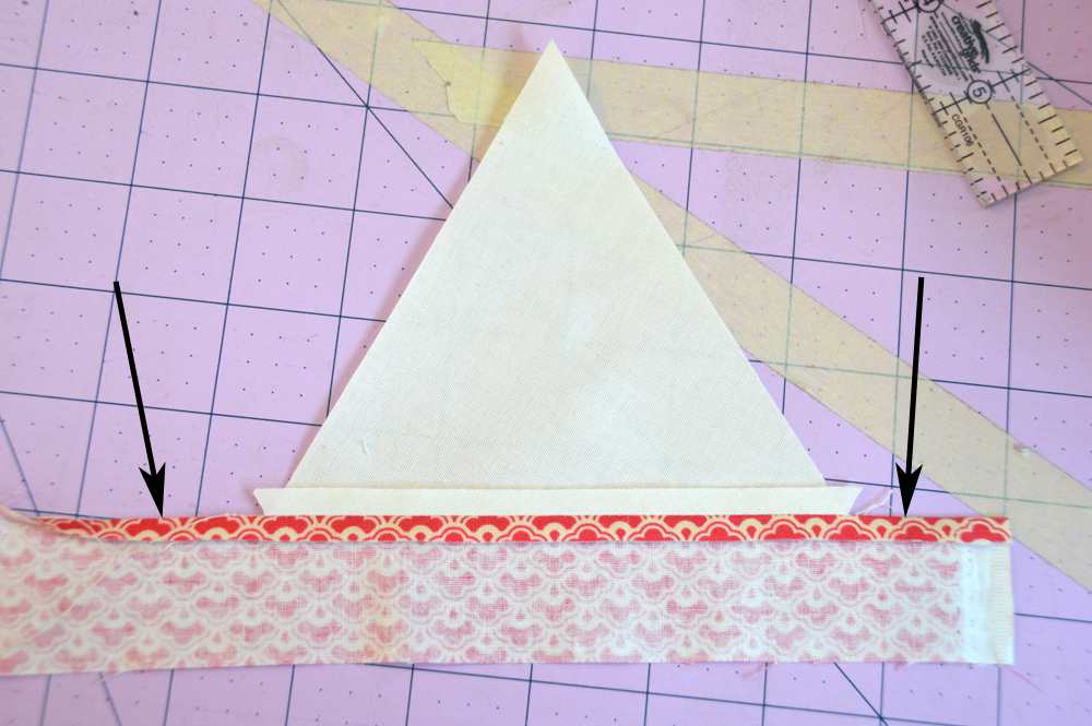 Press the seam open and press the edge of the strip over 1/4" about 1" beyond the edge of the triangle as indicated by the arrows in the photo below. This will help keep your edges "squared" ("triangled"?). If you don't do this, the ends of the strips tend to bow out, away from the center.
