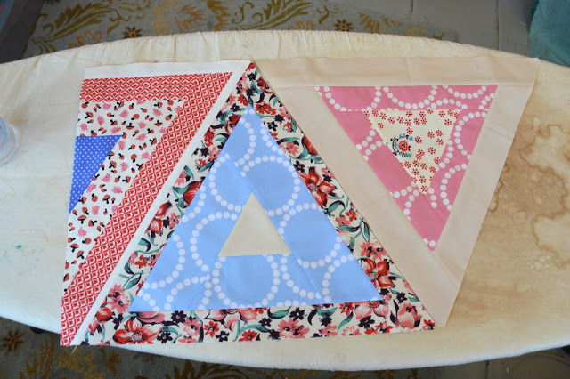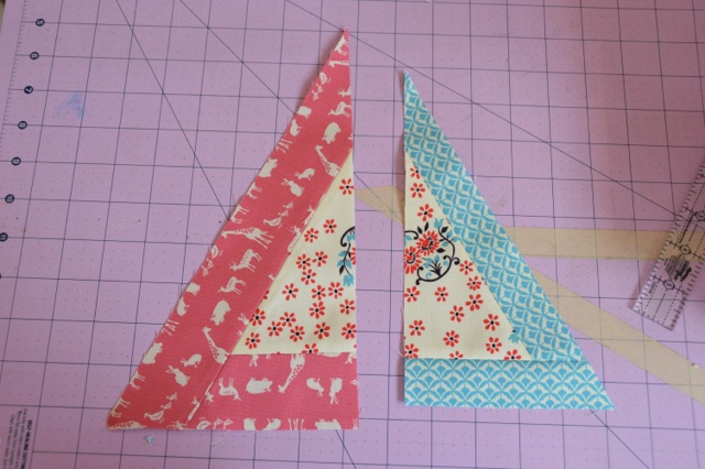 Just like with the full blocks, sew strips to the sides of the centers, pressing seams open after each strip is added. The differences are that this time you are only sewing to two sides of the triangle and you have to make sure the strip on the top (the longer side) extends extra far so that it will meet the edge of the center (see the extra long pointy bits at the top of each block above). As you're sewing, trim the strips in line with that center edge.
