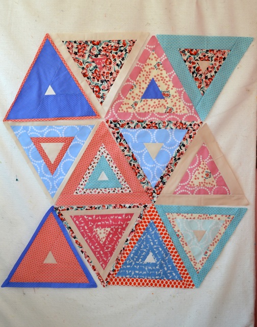It's quite different from my original which used mostly solids. The key to using mostly prints like this is to keep any similarly colored and similarly scaled prints from being right next to each other. I kind of blew it on one pyramid. Can you spot it? The center triangle is a little too hard to distinguish from the row around it.