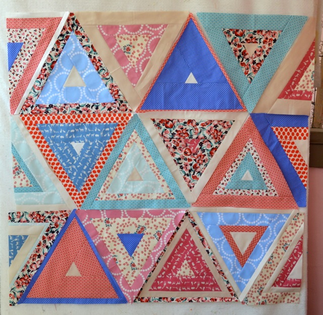 Et voila! All of my blocks finished. You can see all of the lopped off tips on the side blocks. They will all be covered by the binding.