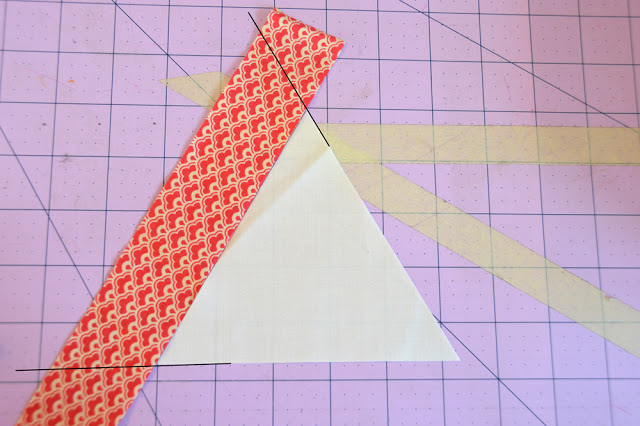 Start with one of your triangle centers and choose a strip to use for your first round of logs. Sew the strip to one side of the center, right sides together but before you do make sure that the strip extends far enough on either edge. Do not line the edge of the strip up with the tip of the triangle. In the photo below the black lines show where the strip needs to extend beyond.