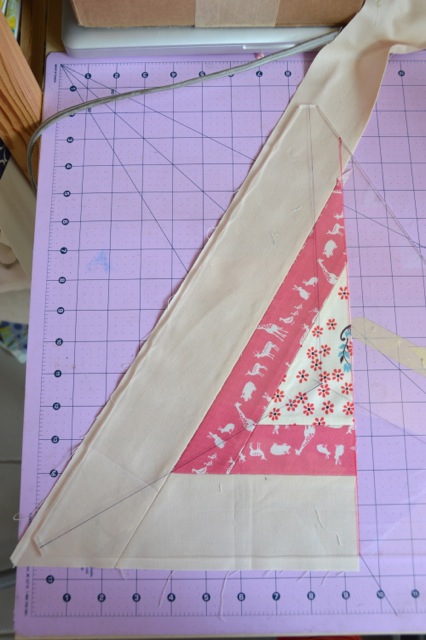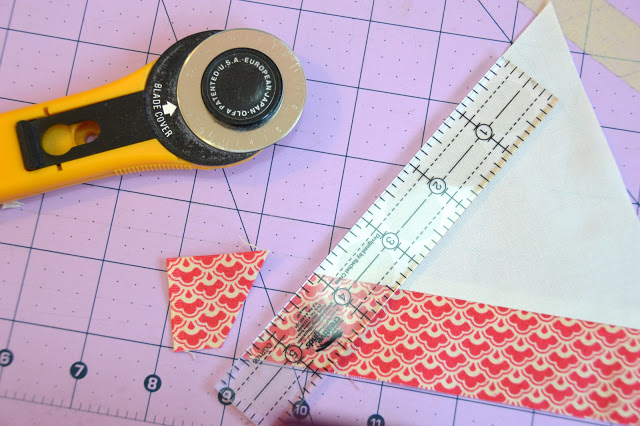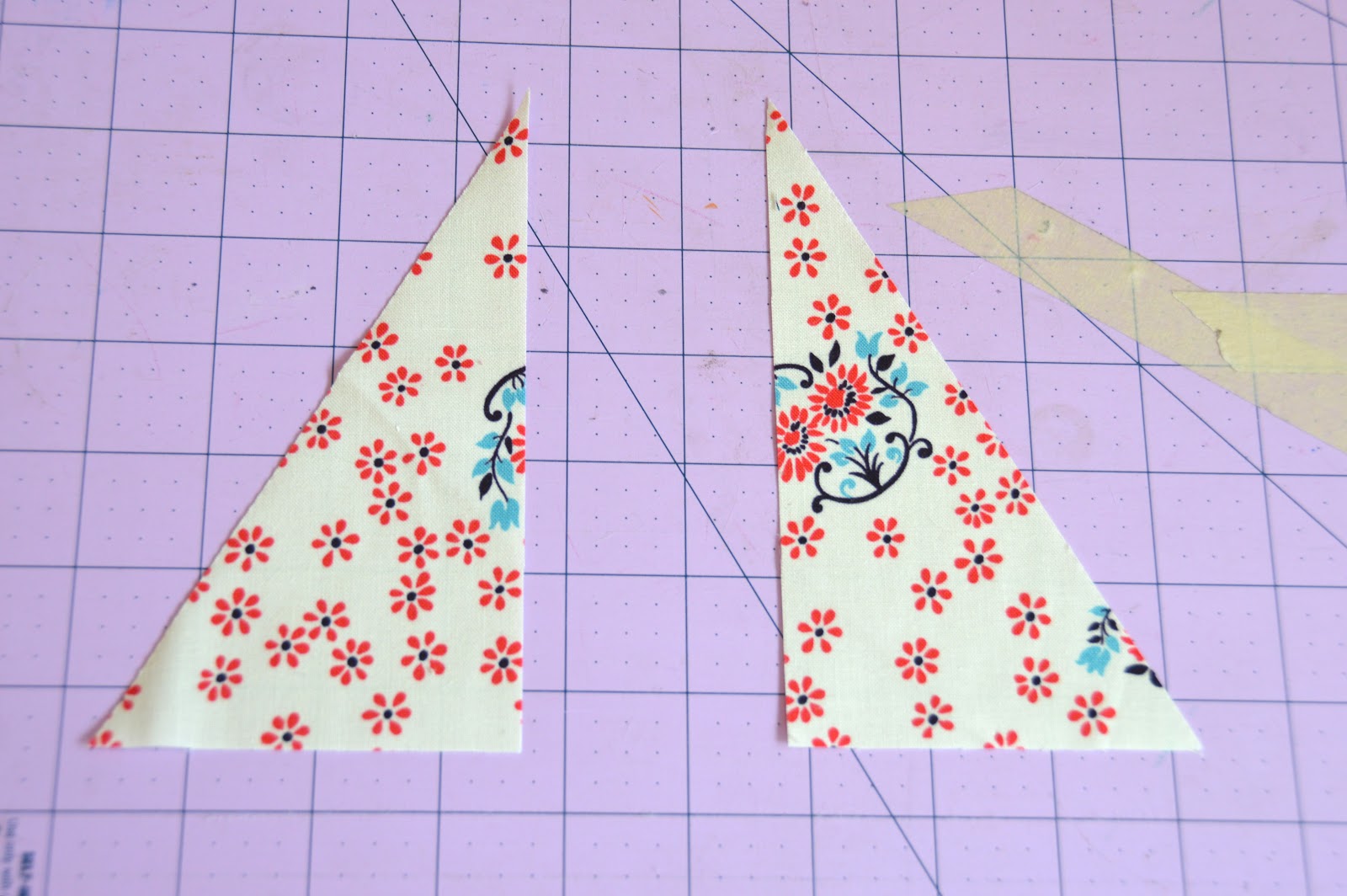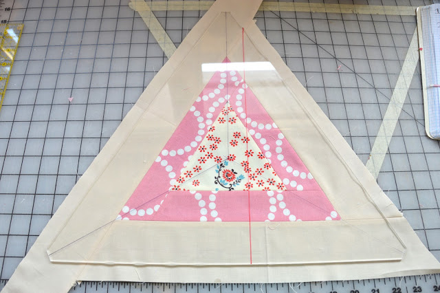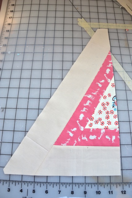 Just like with the full blocks, sew strips to the sides of the centers, pressing seams open after each strip is added. The differences are that this time you are only sewing to two sides of the triangle and you have to make sure the strip on the top (the longer side) extends extra far so that it will meet the edge of the center (see the extra long pointy bits at the top of each block above). As you're sewing, trim the strips in line with that center edge.