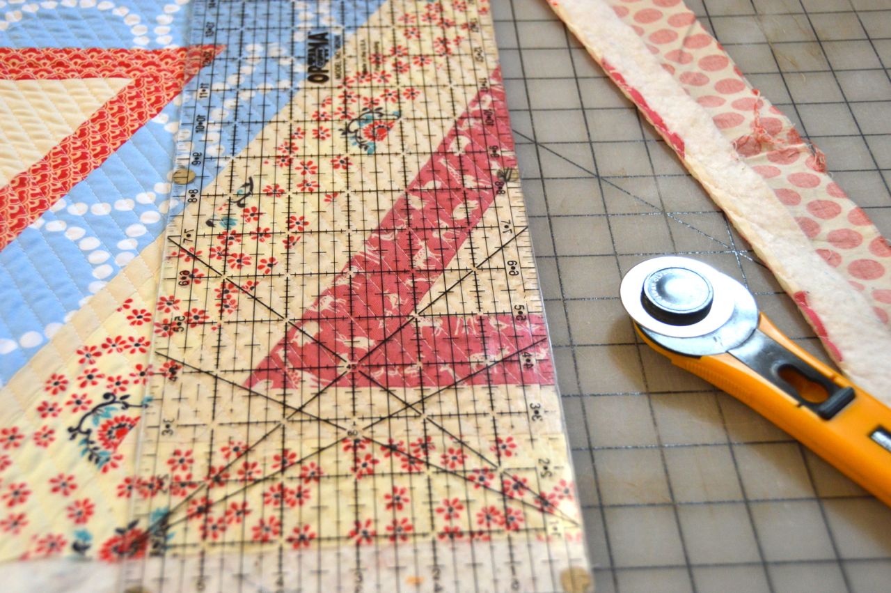 For the left and right sides of the quilt you can trim like normal, along the edges of the quilt top. This is because we took the extra wide binding into account when we made our side blocks. They've got and extra 3/4" of padding that can be covered up without deforming any pyramids.