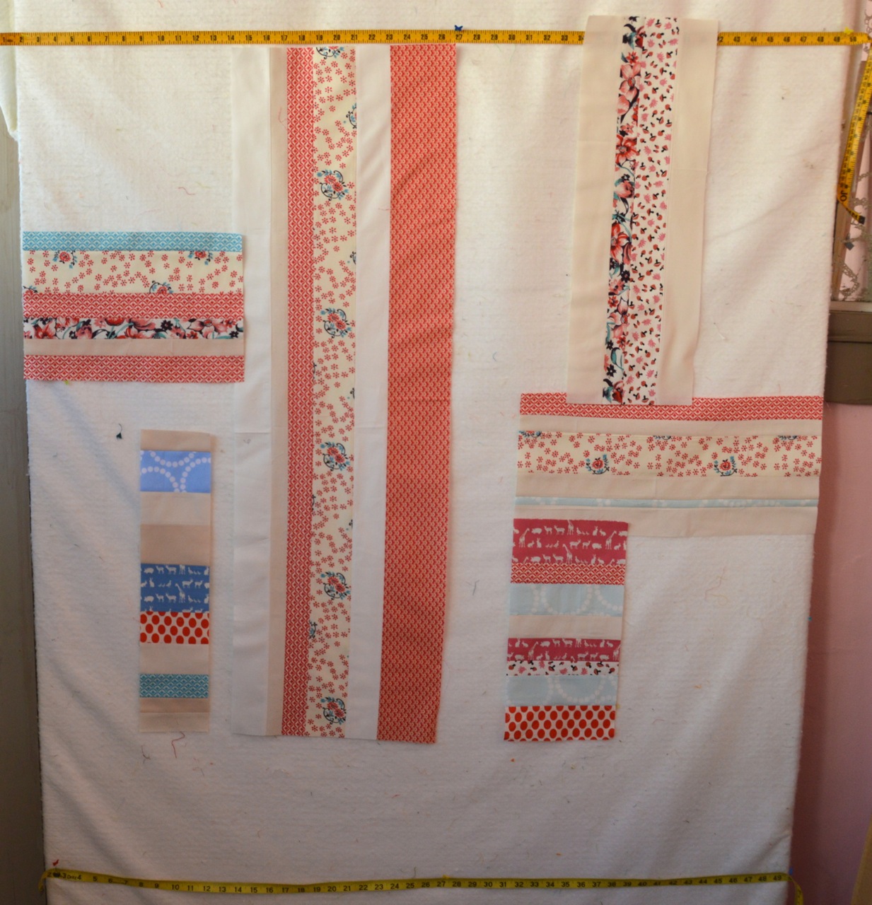I ended up with the pieced sections you see below. I then laid them out on my design wall to then figure out what size pieces I needed to fill in the gaps. You can see that I pinned two tape measures to the wall to indicate how tall the back needed to be (the width of the wall was the same as the width I needed for the back). You could do the same thing with masking tape or painter's tape.
